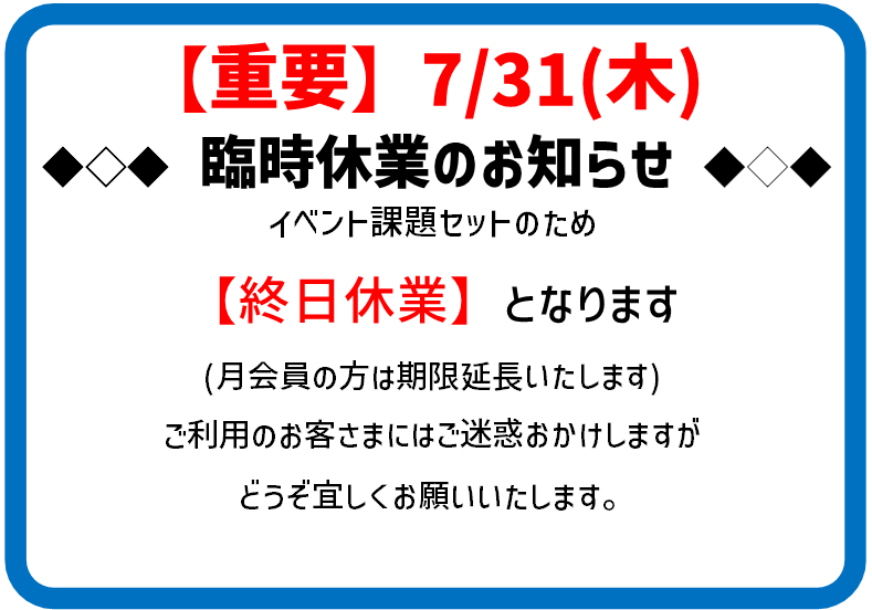7/31(木)はイベントセットのため終日休業いたします。