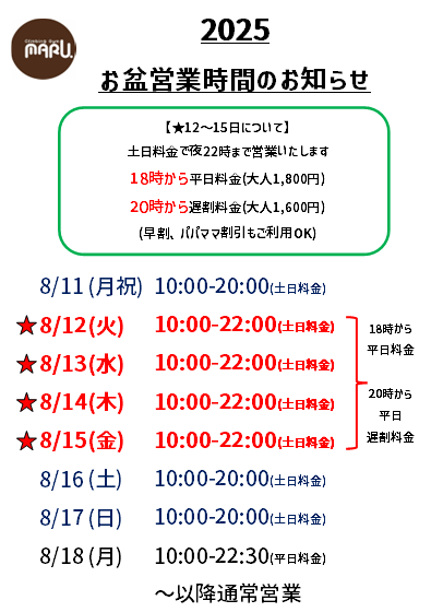 【お盆期間中の営業につきまして】 今年はお出かけの方も多いでしょうか☺️ お盆期間中の『12〜15日』は土日料金で10時〜22時まで営業いたします。 18... -