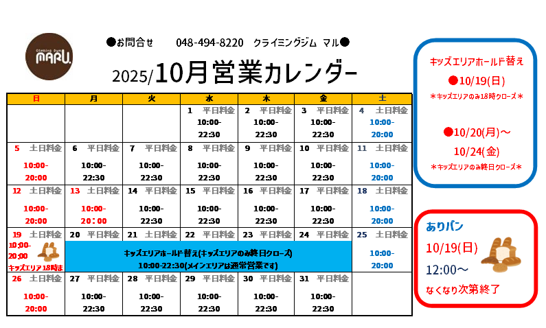 【10月の営業案内】 10月はメインエリアのホールド替えに続いてキッズエリアのホールド替え。 今回も全国を飛び回る人気セッター波田ゆうき君がワクワクたっぷりのキッズエリアに... -